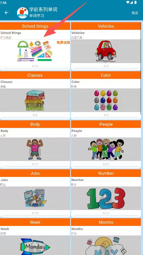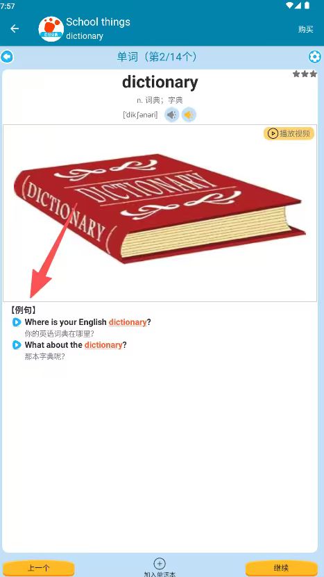 2、选择学习用品等分类,进入单词学习界面。