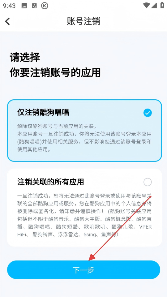 3、选择要注销账号的应用范围,如“仅注销酷狗唱唱”,然后点击【下一步】。
