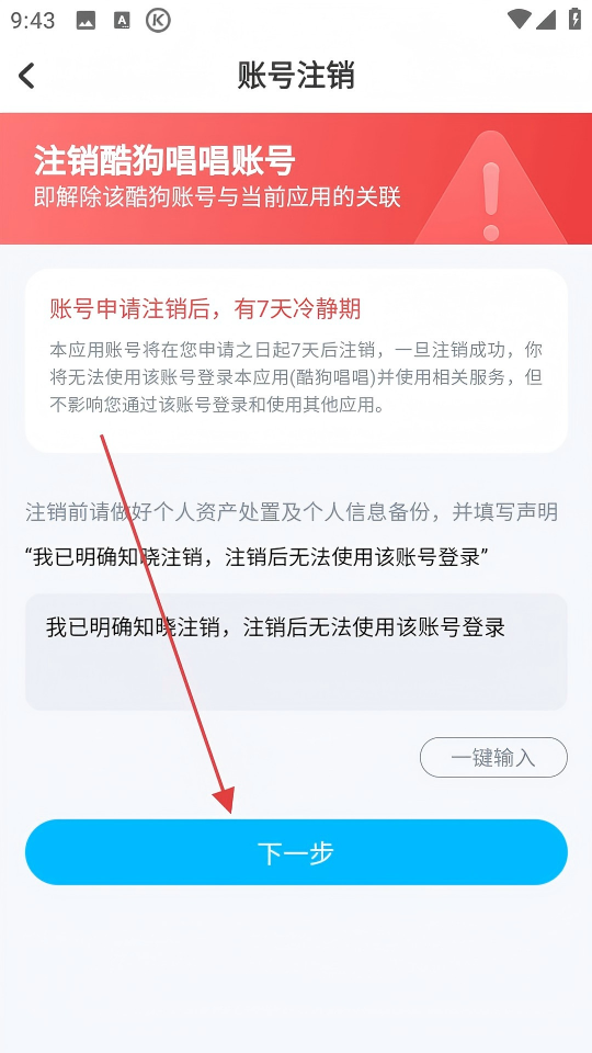 4、阅读账号注销相关说明,确认后点击【下一步】,按照后续提示完成账号注销操作。