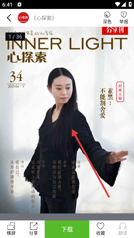 4、在刊物详情页面,可点击底部【下载】按钮下载刊物,也可使用【横屏】【分享】【收藏】【朗读】等功能。