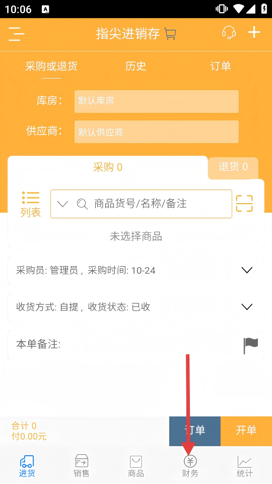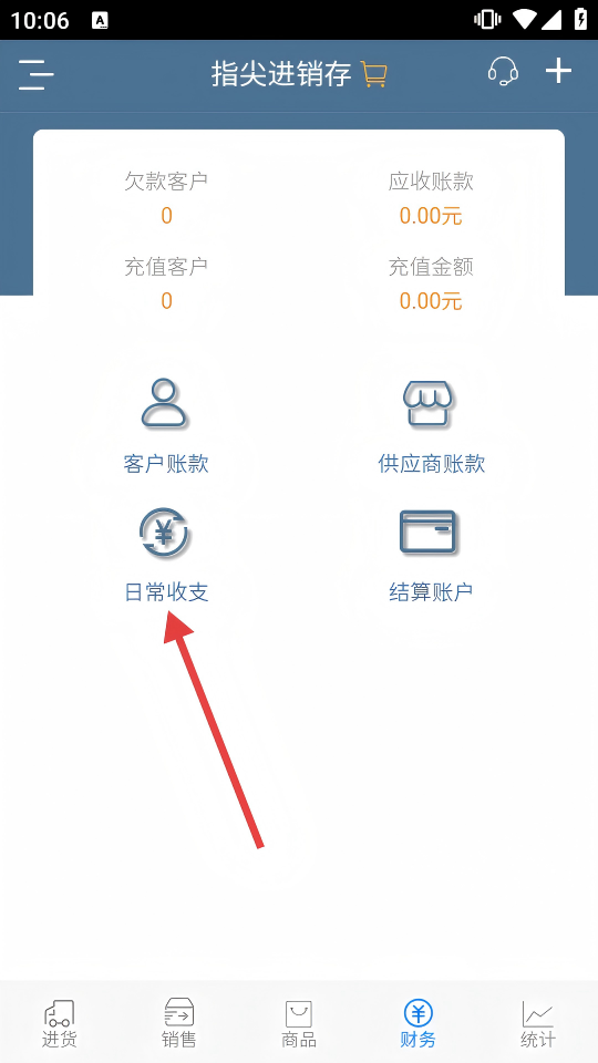 1、在“指尖进销存”主界面,点击底部【财务】,进入财务模块,可进行账款、收支等财务操作。
