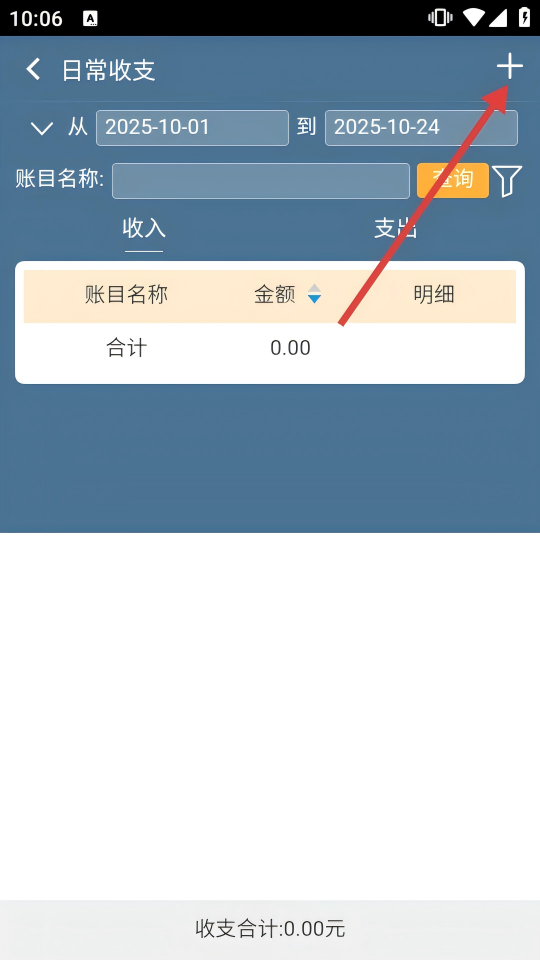 3、在日常收支界面,点击右上角“+”号,开始新增收支操作。