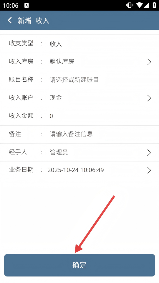 4、在新增收入页面,填写收支类型、库房、账目名称、金额等信息后,点击【确定】,完成日常收支新增。