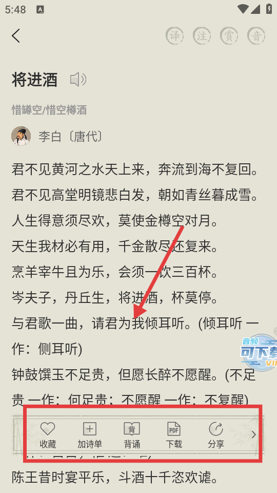 4、在完整诗文页面,可使用【收藏】【加诗单】【背诵】【下载】等功能进行操作。