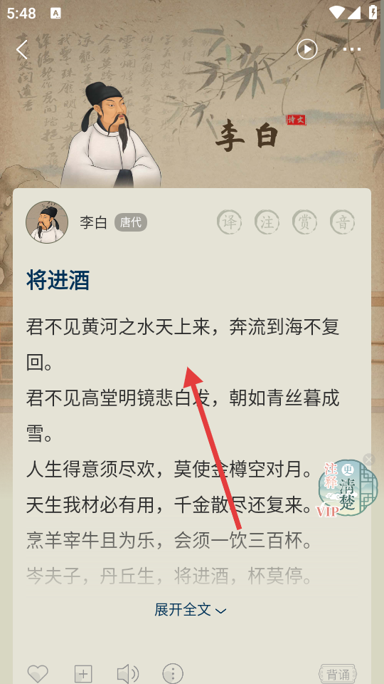 3、在诗文展示页面可查看诗文内容,如《将进酒》,点击【展开全文】可查看完整诗文。