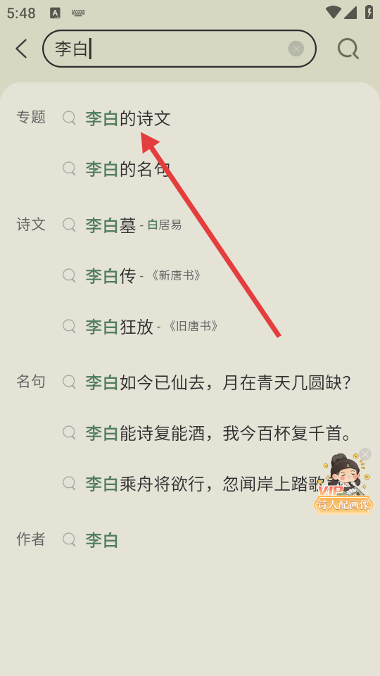 2、在搜索结果中点击【李白的诗文】选项,进入李白诗文展示页面。