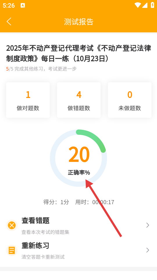 4、答题完成后,可查看测试报告,了解做对题数、做错题数、正确率等信息,还可查看错题或重新练习。