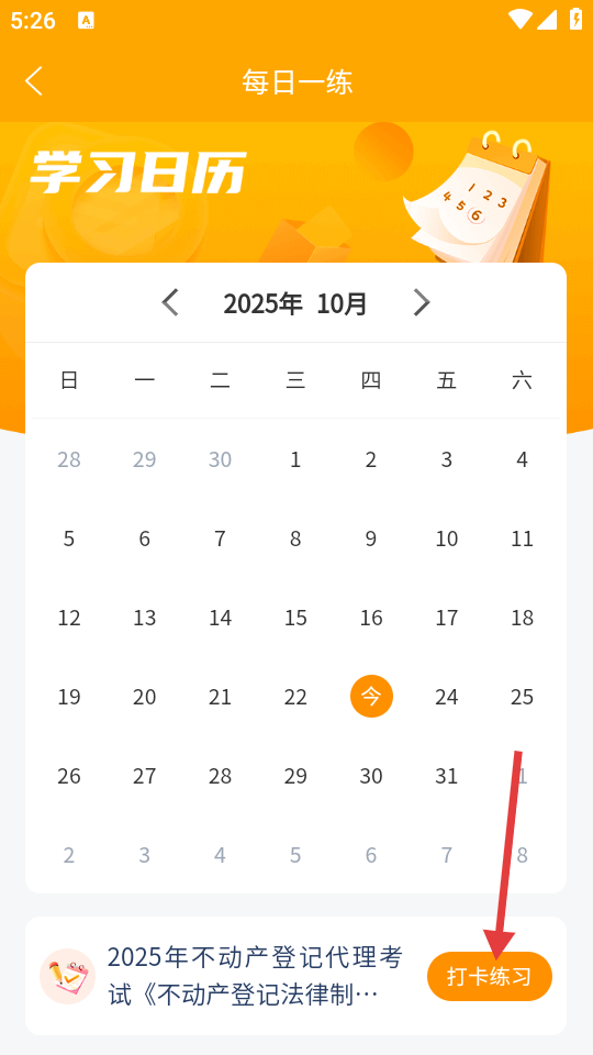 2、在学习日历页面中,选择日期后,点击【打卡练习】按钮,进入答题页面。