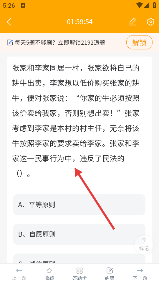3、在答题页面中,完成题目作答,如涉及民法原则的题目,根据知识点选择正确答案。