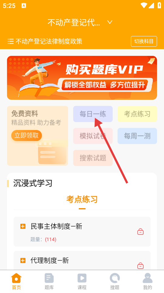 1、在首页中,点击【每日一练】选项,进入每日一练的学习日历页面。