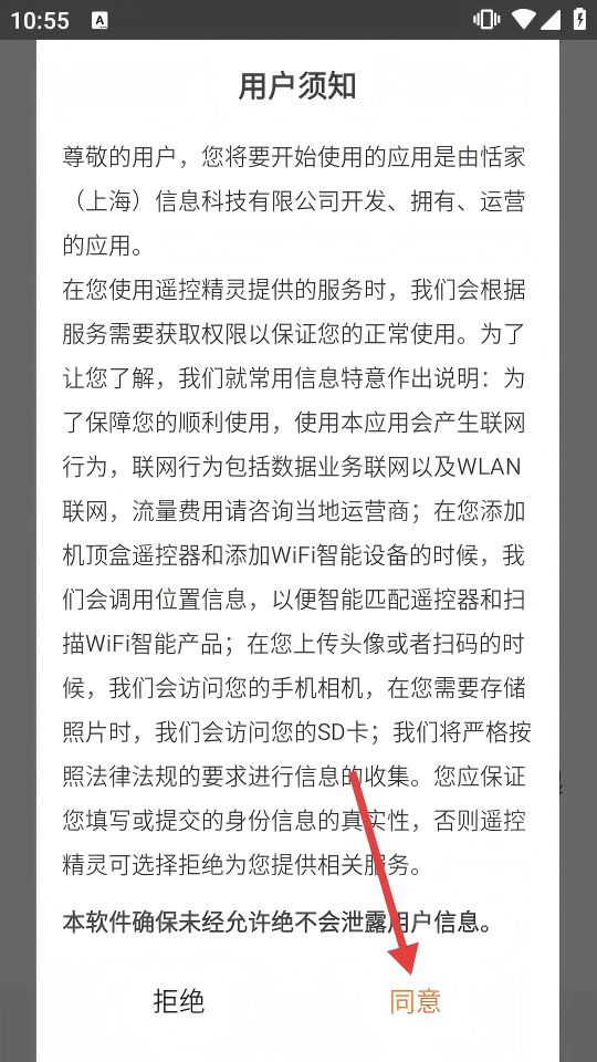 1、使用“遥控精灵”前,阅读《用户须知》后点击【同意】,进入应用主界面。