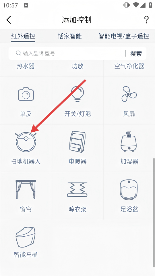 2、在“添加控制”页面,选择【扫地机器人】设备类型,进入品牌选择环节。