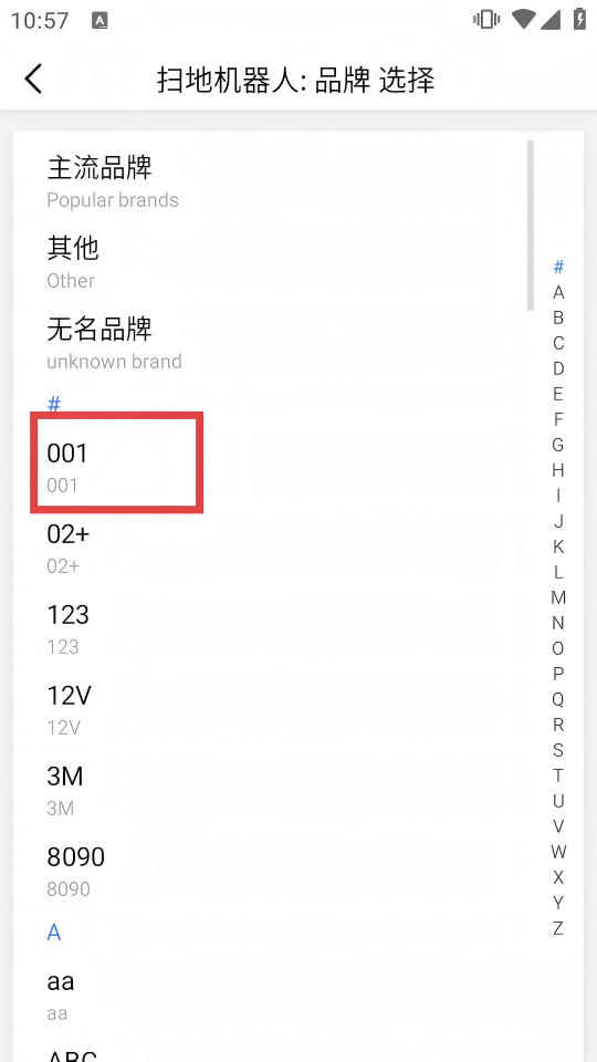 3、在品牌选择中,找到并选择【001】品牌,进入设备搜索页面。