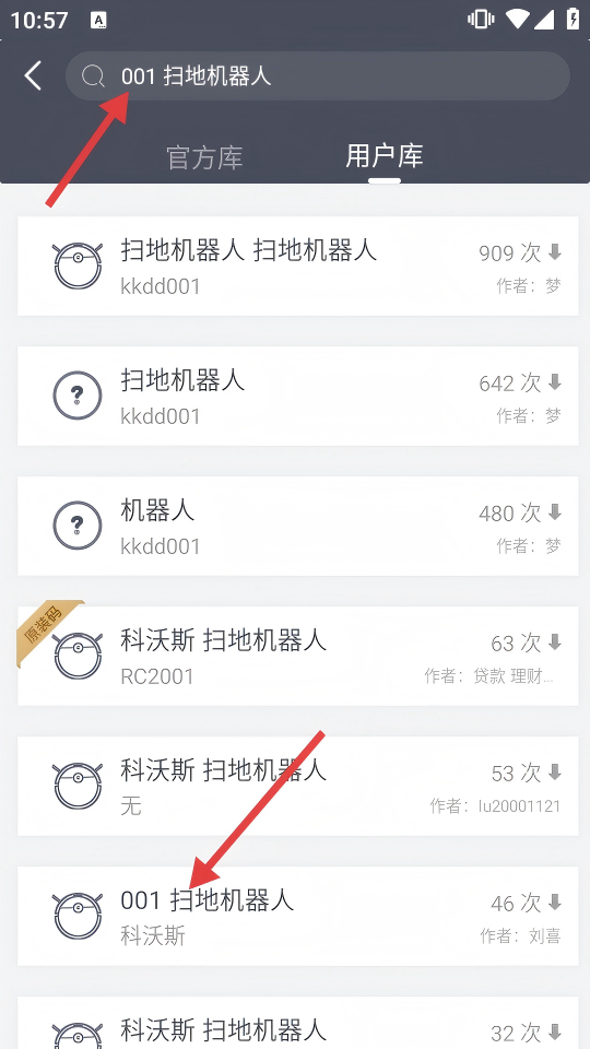 4、在搜索页面,输入“001扫地机器人”进行搜索,选择对应的设备,完成扫地机器人的控制添加。
