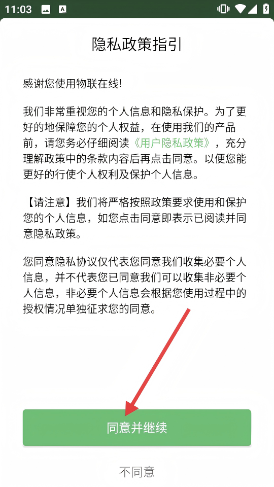 1、使用“物联在线”前,阅读《隐私政策指引》后点击【同意并继续】,进入登录注册界面。