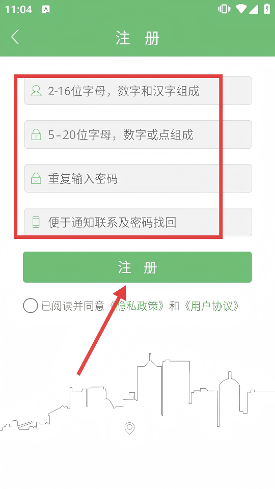 4、填写用户名、密码、重复密码、手机号,勾选同意《隐私政策》和《用户协议》后点击【注册】,完成账号注册。