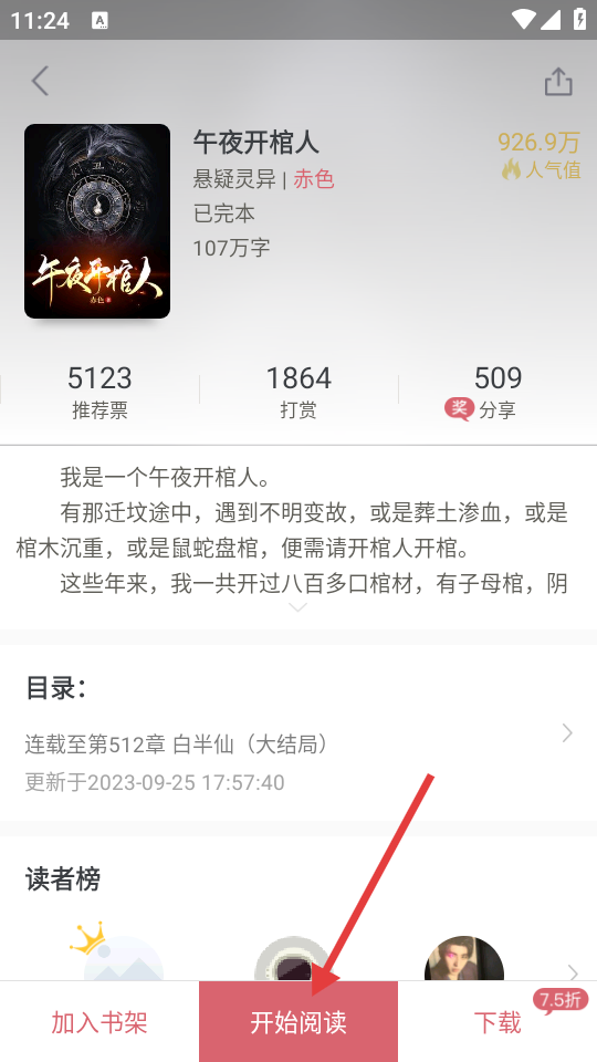 3、在作品详情页面,点击【开始阅读】按钮,进入作品阅读页面。