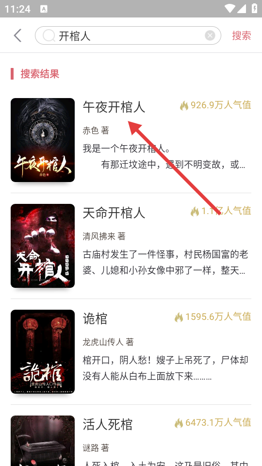 2、在搜索结果中,点击感兴趣的作品,如【午夜开棺人】,进入作品详情页面。