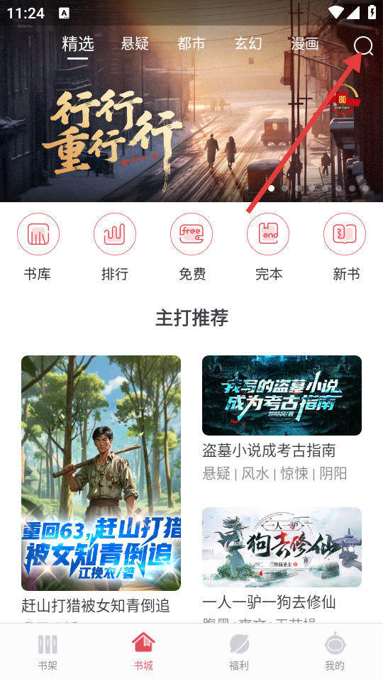 1、点击书城页面,右上角的搜索图标,进入搜索页面并输入关键词,如【开棺人】。