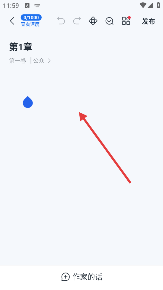 4、在章节写作页面,可进行第1章的内容创作,完成后可点击【发布】按钮发布作品。