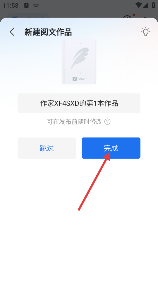 2、在新建阅文作品设置页面点击【完成】按钮,进入作品信息确认页面。
