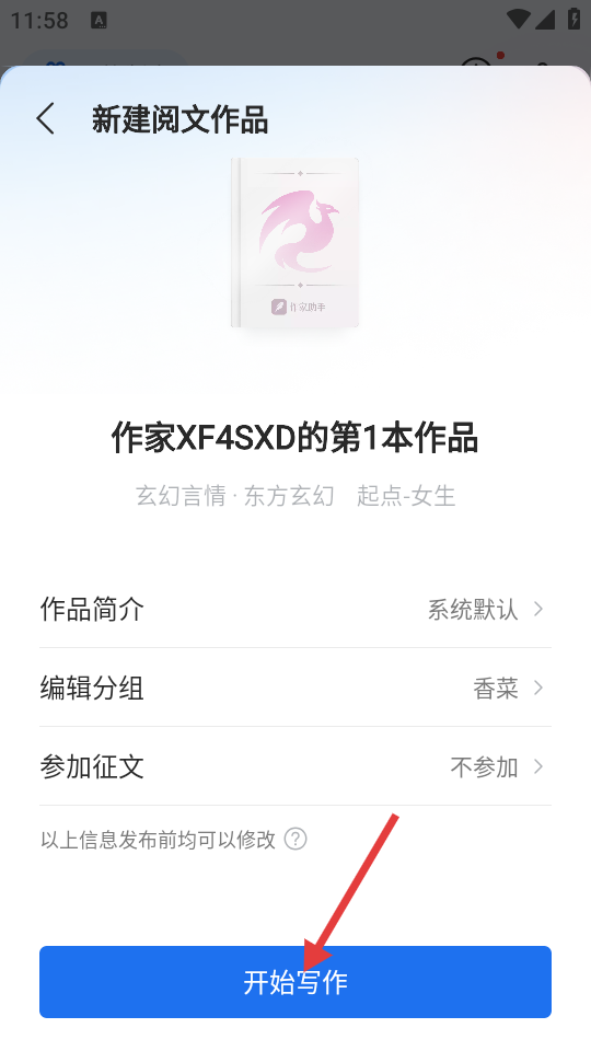 3、在作品信息确认页面,点击【开始写作】按钮,进入章节写作页面。