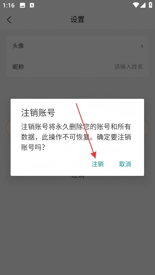 3、在设置界面点击【注销】,弹出注销账号确认框。