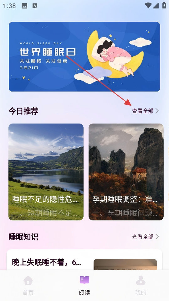 2、在阅读页面点击“今日推荐”右侧的【查看全部】,进入今日推荐列表页面。
