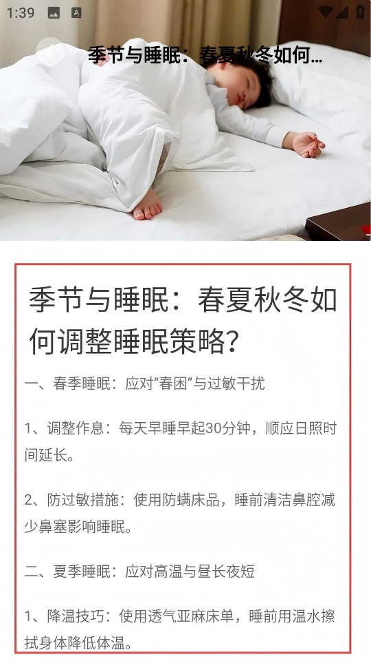 4、在文章详情页面即可查看关于季节与睡眠调整策略的详细内容。