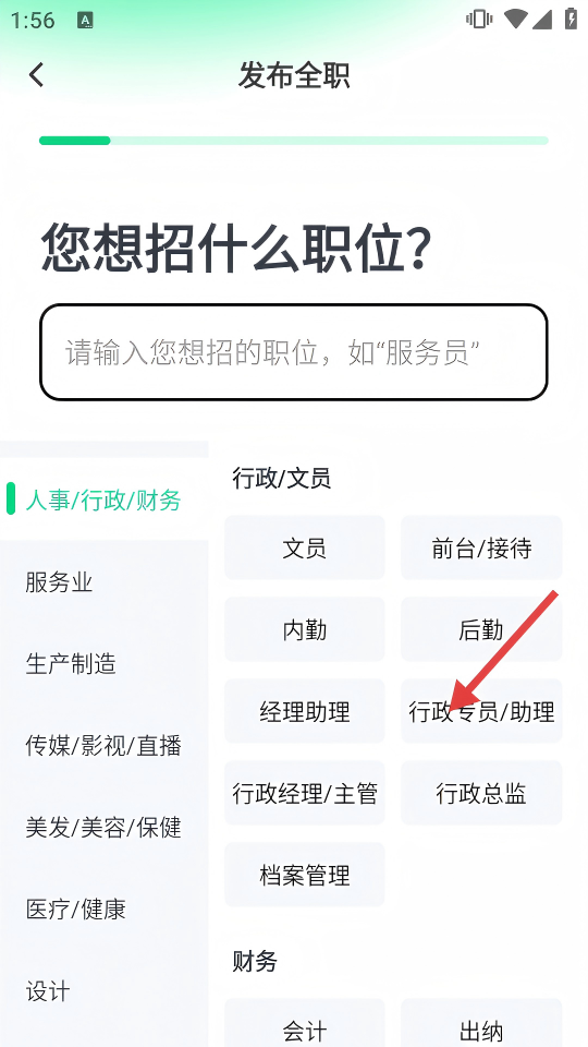 2、在“发布全职”页面,选择招聘职位,例如【行政专员/助理】。