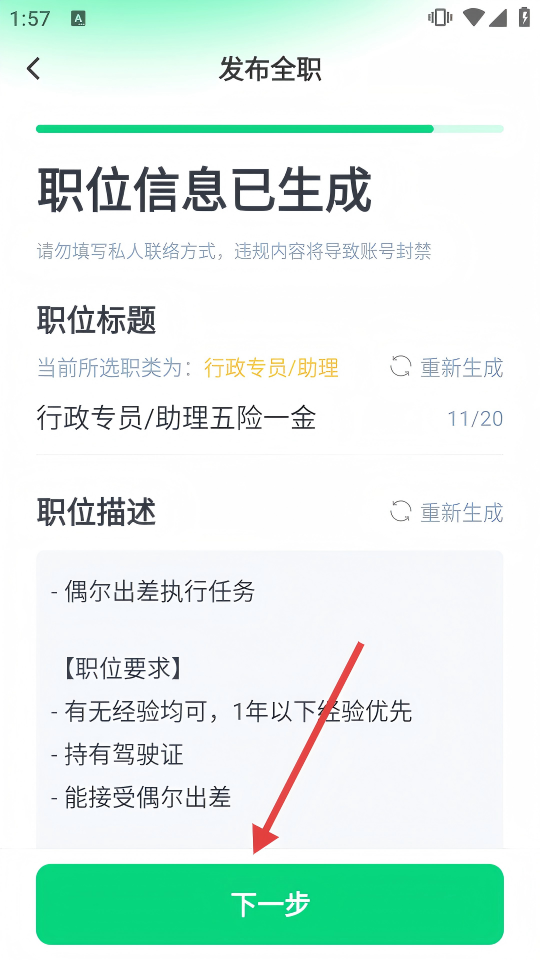 3、职位信息生成后,点击【下一步】,进入联系方式添加环节。