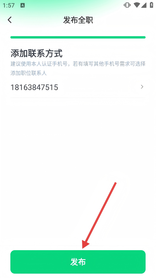 4、添加联系方式后,点击【发布】,完成全职职位的招聘发布操作。