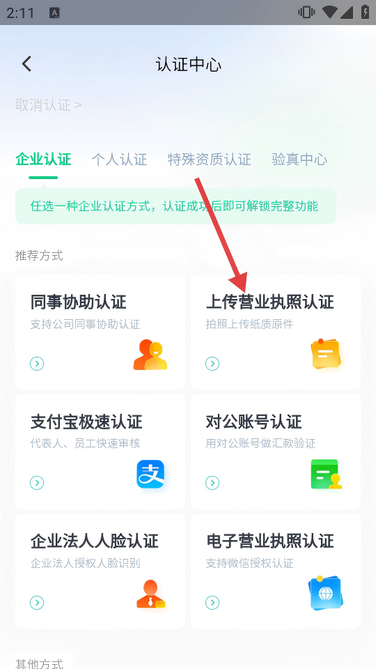 3、在认证中心,选择【上传营业执照认证】的方式,进入图片上传环节。