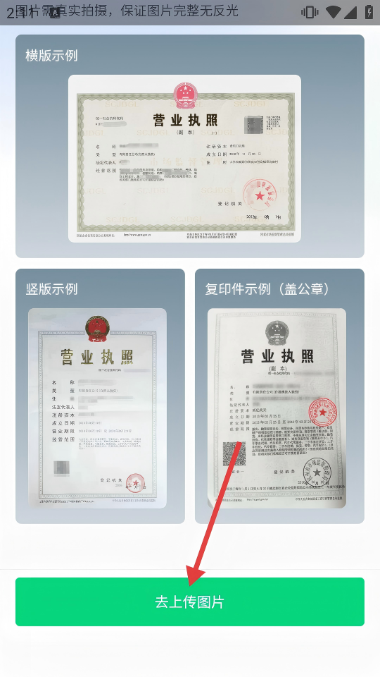 4、按照示例要求,点击【去上传图片】,上传营业执照的真实图片,完成企业认证操作。