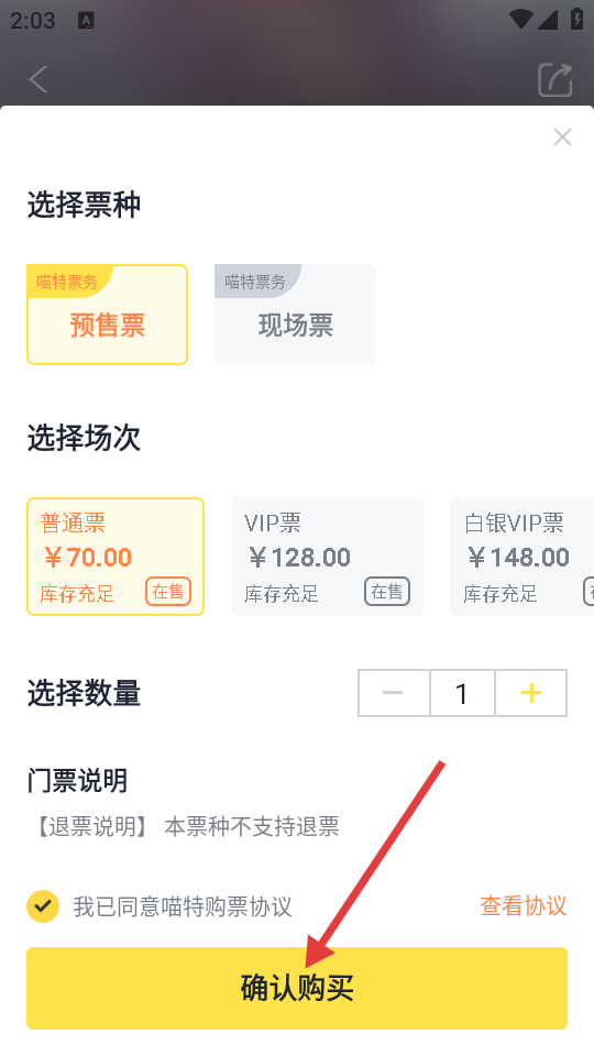 4、在票种选择页面,选择票种、场次、数量,勾选购票协议后,点击【确认购买】按钮完成购票操作。