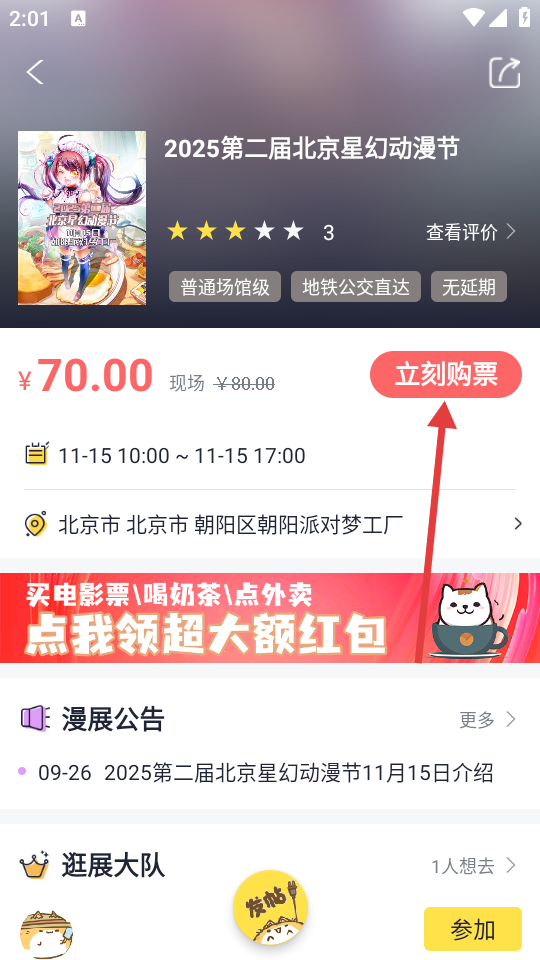 3、在漫展详情页面,点击【立刻购票】按钮,进入票种选择页面。