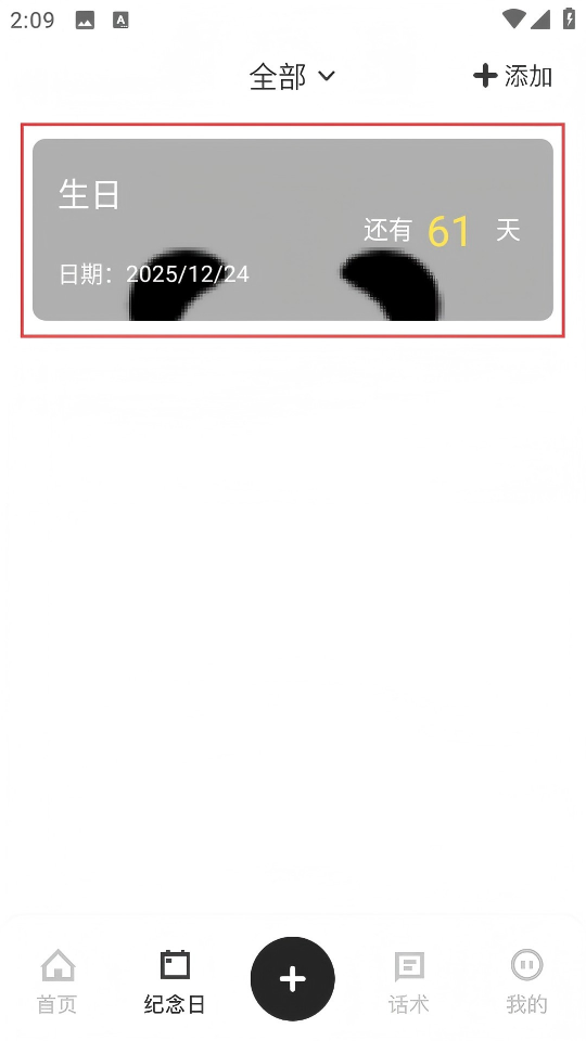 4、保存后即可在纪念日页面看到添加的纪念日,显示距离该日期的剩余天数。