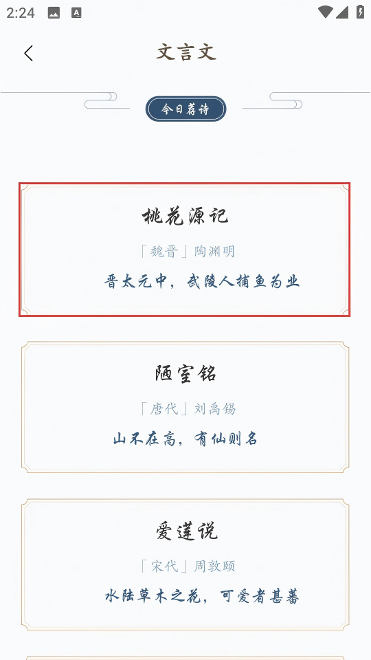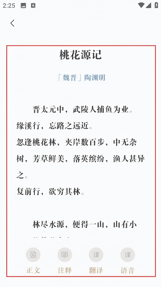 3、在列表中选择《桃花源记》,进入文章详情页面。
