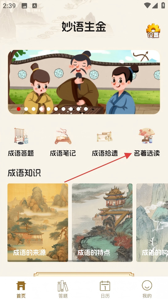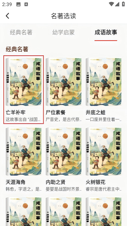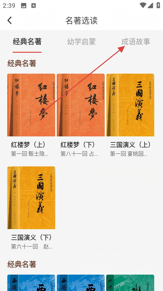 2、在名著选读页面点击【成语故事】标签,进入成语故事列表页面。