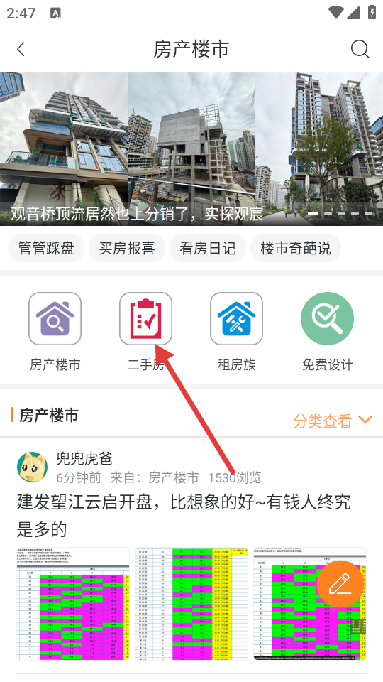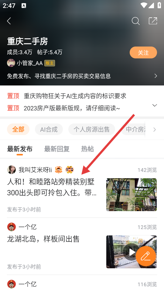 3、在重庆二手房板块,点击感兴趣的二手房帖子,查看房源基本信息。