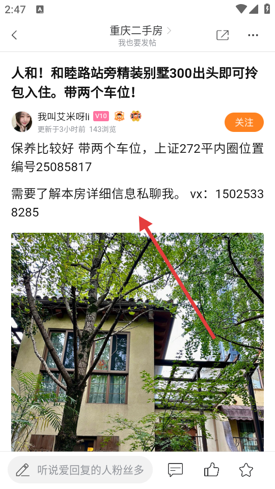 4、进入二手房帖子详情页,可查看房源详细描述,若需了解更多可按提示私聊获取信息。