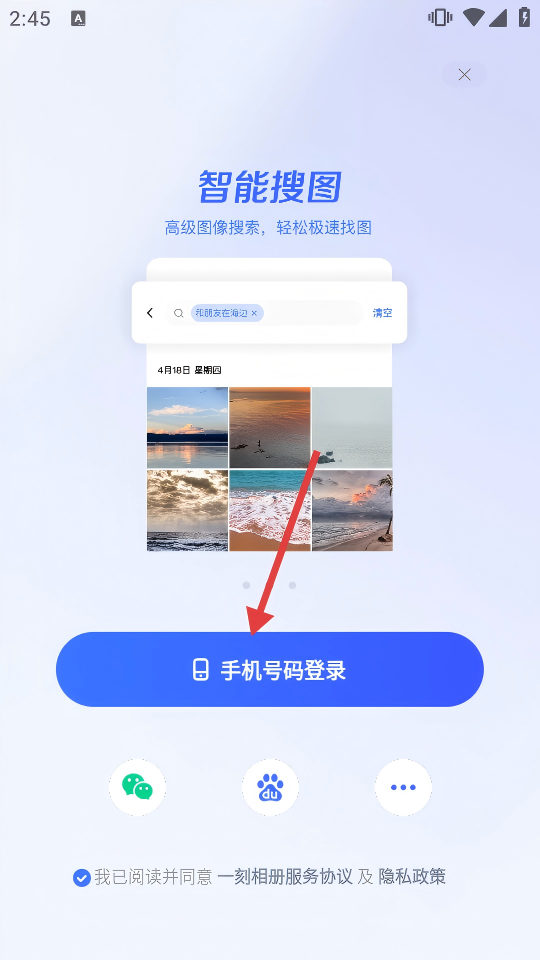 1、进入“一刻相册”登录界面,点击【手机号码登录】,进入登录账号页面。