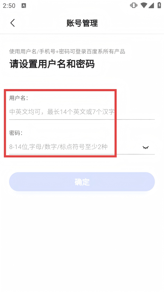 4、在账号管理页面,设置用户名和密码,点击【确定】,完成百度账号注册及“一刻相册”登录操作。