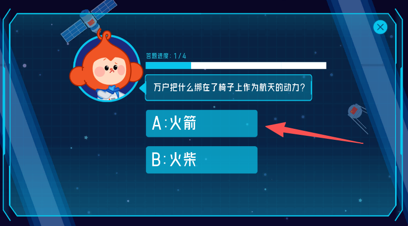 2、互动答题功能,设置航天知识答题环节,如万户航天动力问题,以互动形式强化知识记忆。