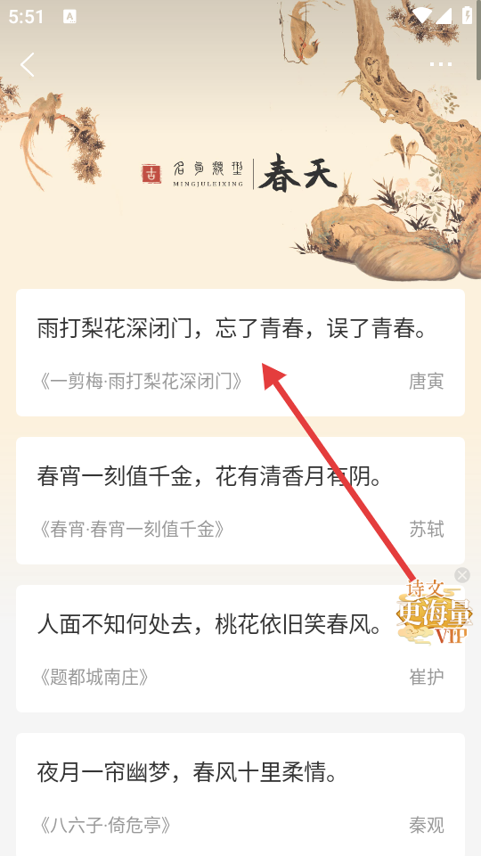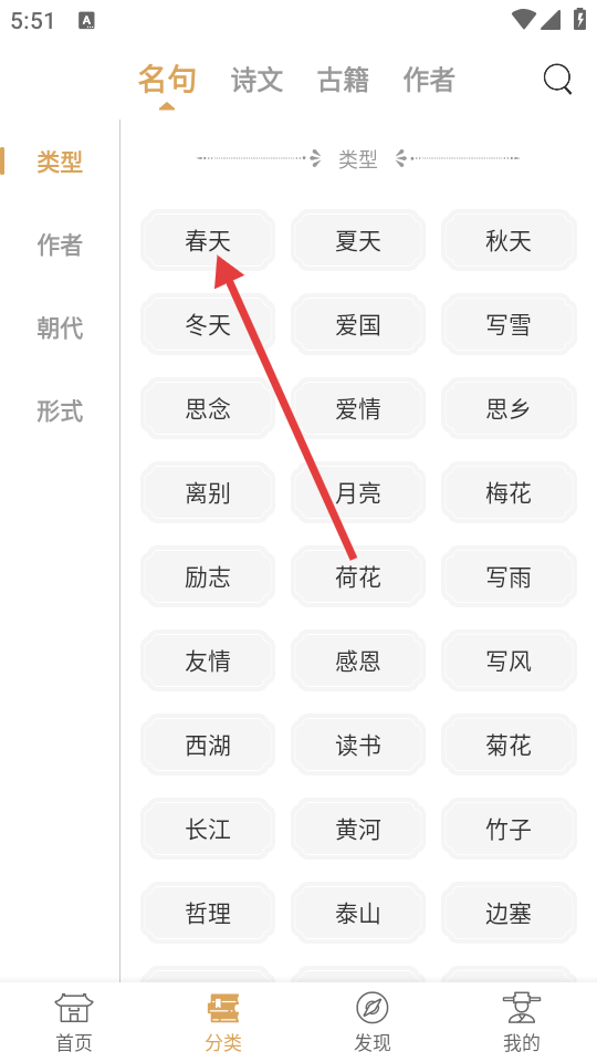 2、在分类页面的名句类型中,选择点击【春天】标签,筛选出描写春天的名句。