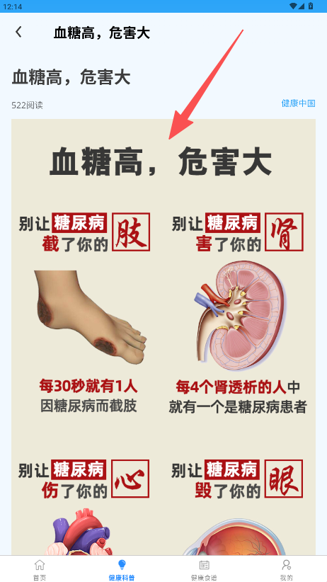 3、呈现形式佳,科普内容图文结合,如“血糖高,危害大”的图文讲解,信息传递直观。