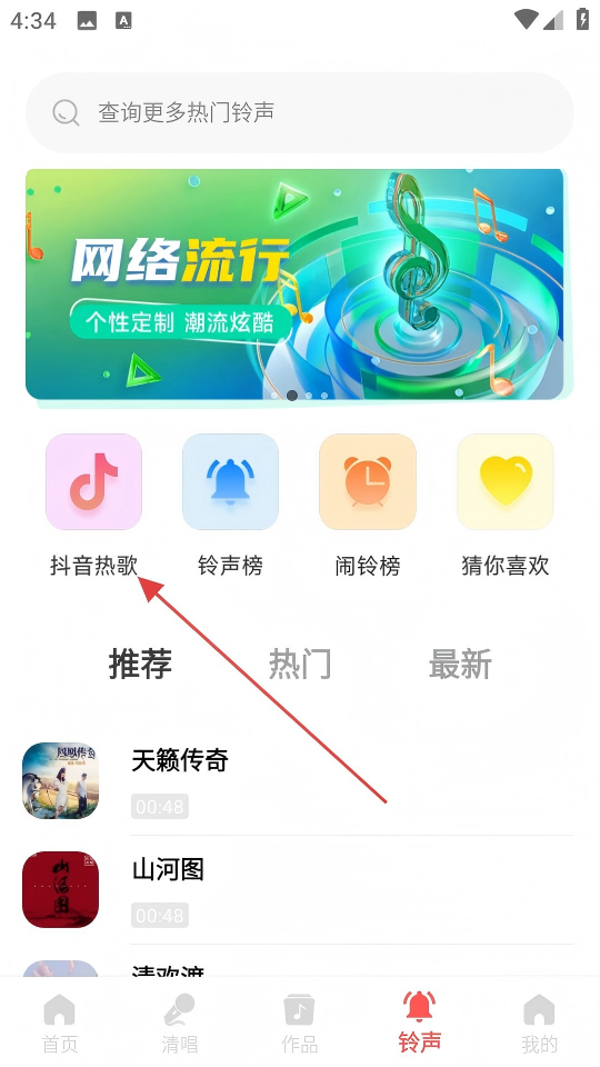 2、在铃声页面点击【抖音热歌】,进入抖音热歌榜页面。