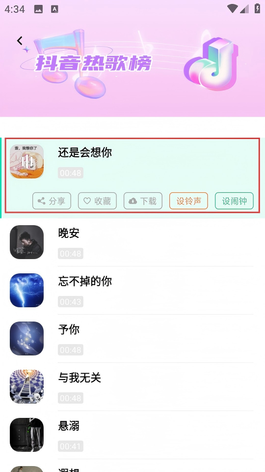 5、内置抖音热歌、闹铃榜等分类铃声库,支持音频片段裁剪与一键设置,轻松打造专属手机铃声。