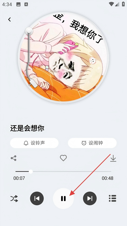 4、在播放页面可点击暂停按钮,控制歌曲的播放状态,也可进行设铃声、设闹钟等操作。