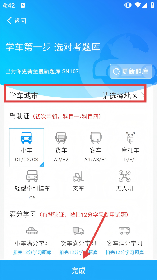 1、进入驾考软件,先选择【学车城市】和驾驶证类型,点击【完成】,完成考题库初始设置。